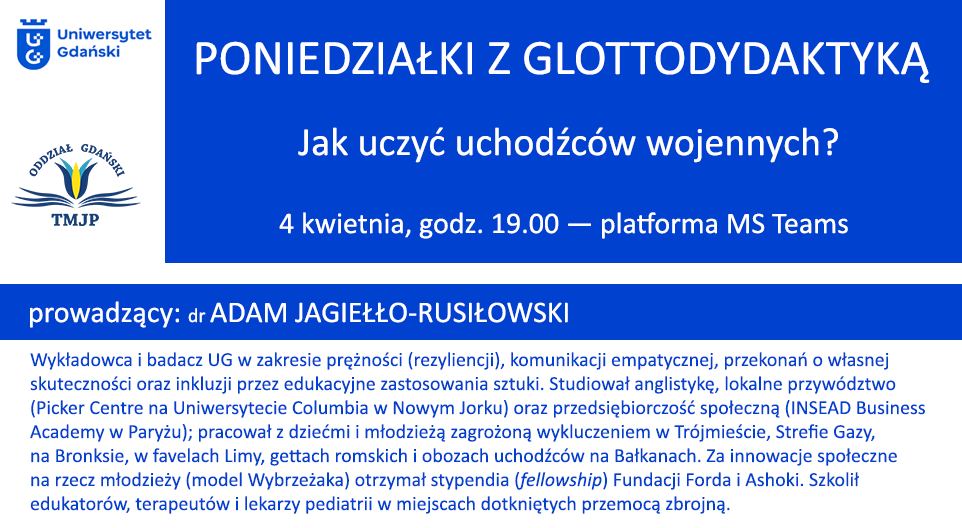 Zapraszamy na wykład dra Adama Jagiełły-Rusiłowskiego, którego celem jest wyposażenie słuchaczy w narzędzia budujące prężność osób uczących się języka i obniżające ich lęki przed niepowodzeniem. Słuchacze: